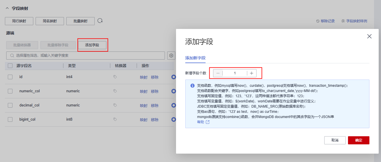 您可以单击字段映射界面“添加字段”,设置“新增字段个数”自定义新增字段,通常用于标记数据库来源,以确保导入到目的端数据的完整性。