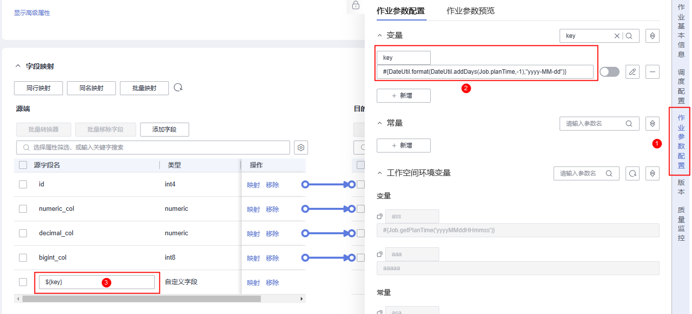 举例:支持调用作业参数配置中已配置的变量、常量等参数使用,如已在作业参数配置中配置key:#{DateUtil.format(DateUtil.addDays(Job.planTime,-1),"yyyy-MM-dd")},自定义字段设置为:${key}即可调用。