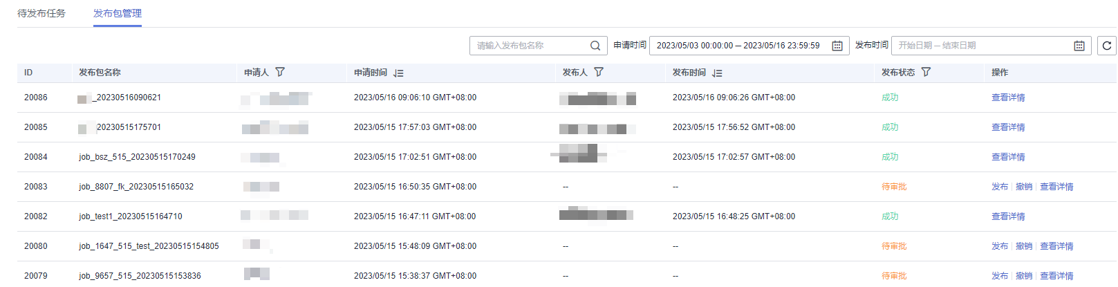 支持通过“申请人”、“申请时间”、“发布时间”、“发布人”和“发布状态”进行发布项筛选。同时可以使用发布包名称进行模糊查询。图2 查看任务状态