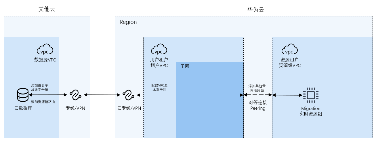 - migration资源组不具有公网网段,因此本方案仅能与数据源的私网连通。