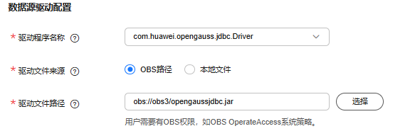- 使用RDS PostgreSQL创建gaussdb数据连接时,驱动名称选择com.huawei.opengauss.jdbc.Driver,使用opengaussjdbc驱动jar包,需要需申请白名单,在GaussDB官方文档中搜索“获取驱动jar包”或“JDBC包、驱动类和环境类”,然后选择实例类型和数据库引擎版本对应的场景资料,参考文档获取驱动包。