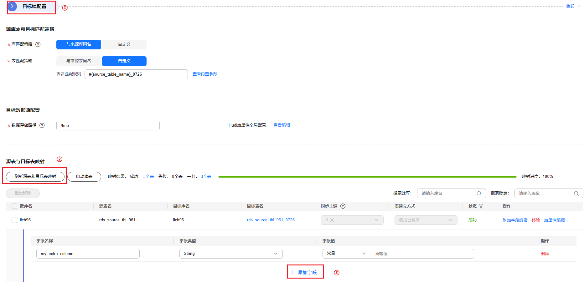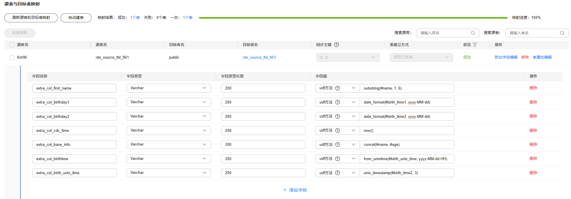 作业编辑阶段,目标端配置,刷新源表和目标表映射后可以为指定表添加附加字段。
