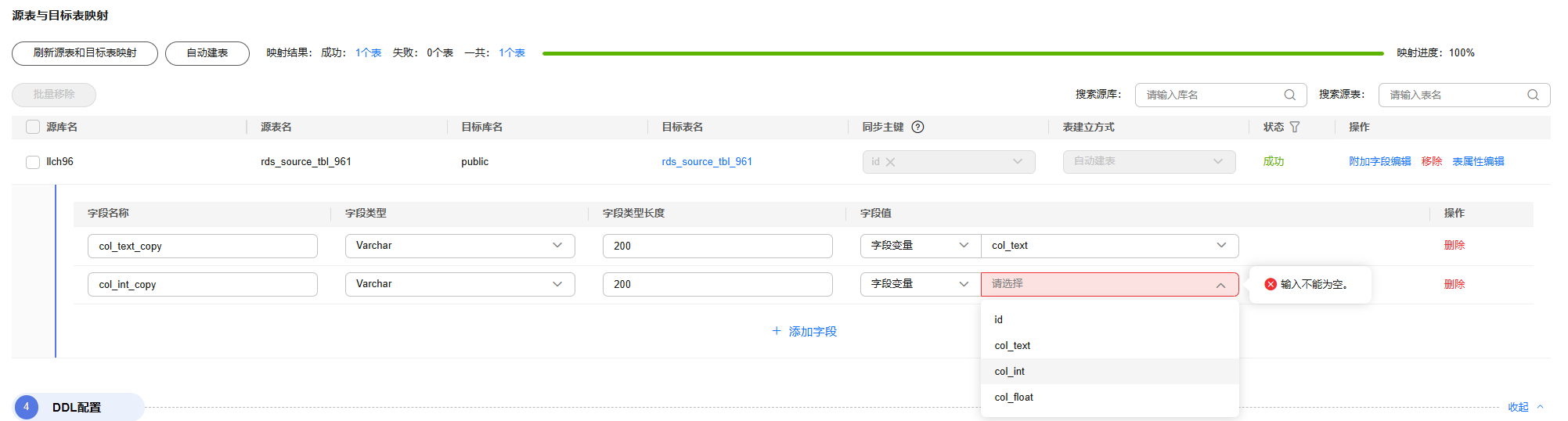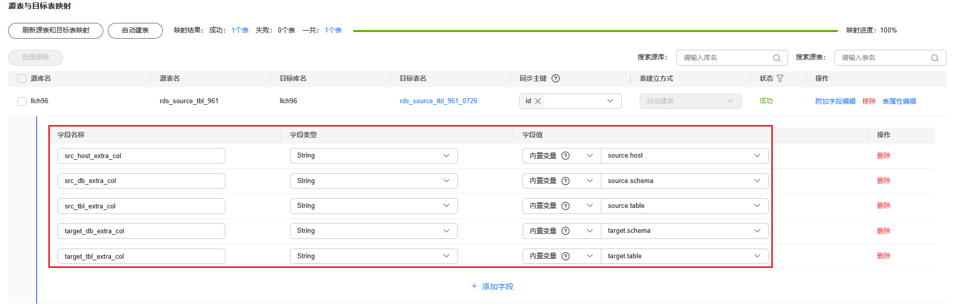 - 当附加字段名与源端已有字段名重名时自动建表可能会失败,提示字段名重复,用户需要手动完成建表。