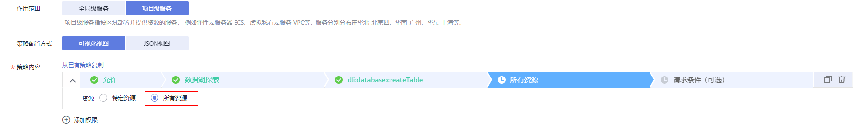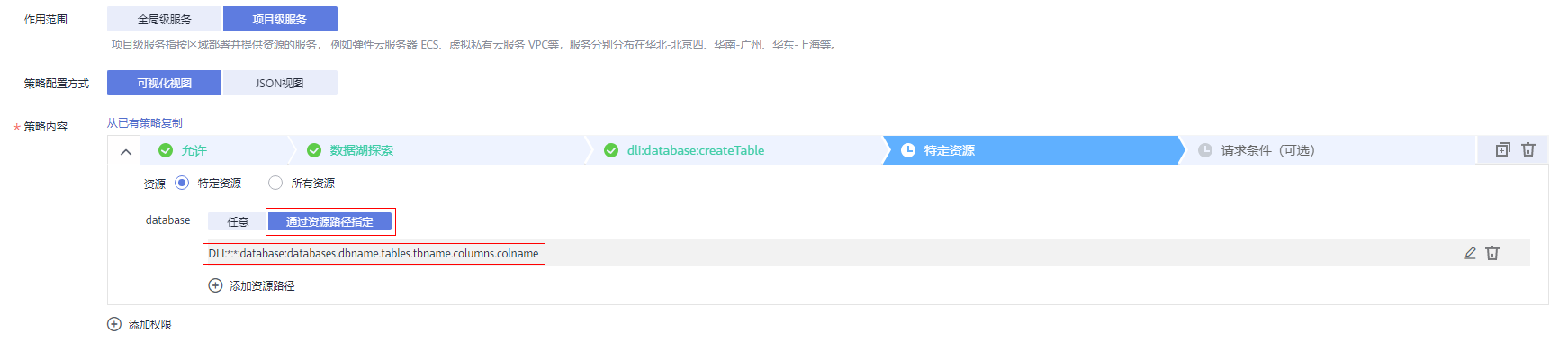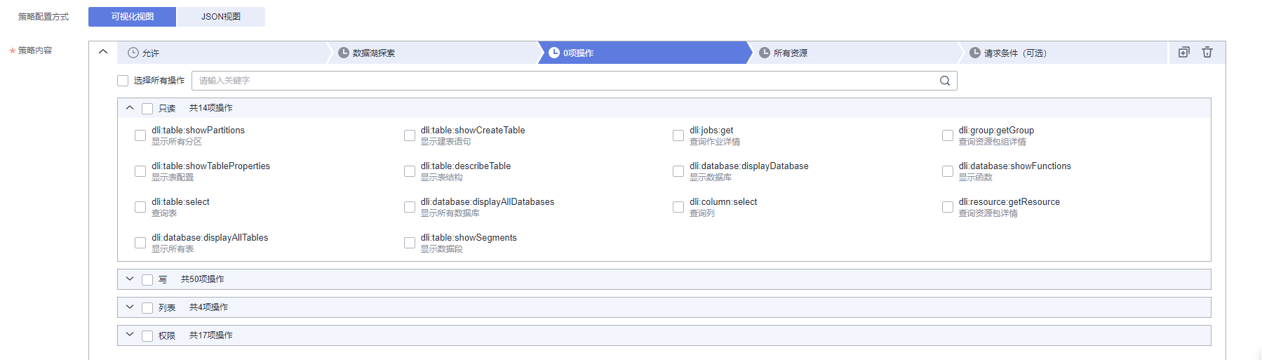 您可以在创建自定义策略时,通过添加“请求条件”(Condition元素)来控制策略何时生效。请求条件包括条件键和运算符,条件键表示策略语句的 Condition 元素,分为全局级条件键和服务级条件键。全局级条件键(前缀为g:)适用于所有操作,服务级条件键(前缀为服务缩写,如dli)仅适用于对应服务的操作。运算符与条件键一起使用,构成完整的条件判断语句。