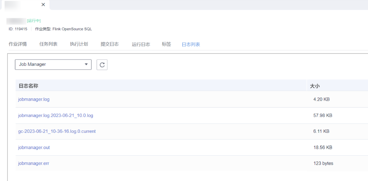 - 在“日志列表”页签,选择JobManager和TaskManager,查看详细的日志文件。