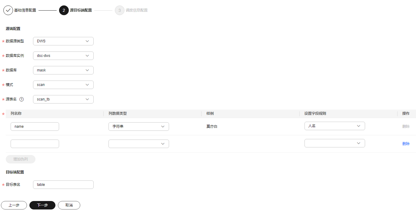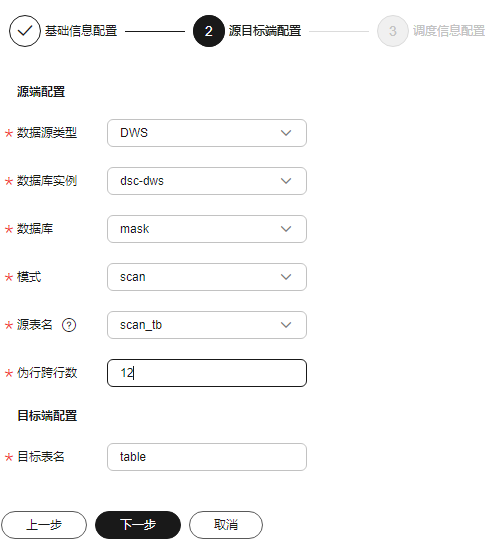 - 单击“下一步”,进入“源目标端配置”界面,请按照参数列表2配置相关参数。