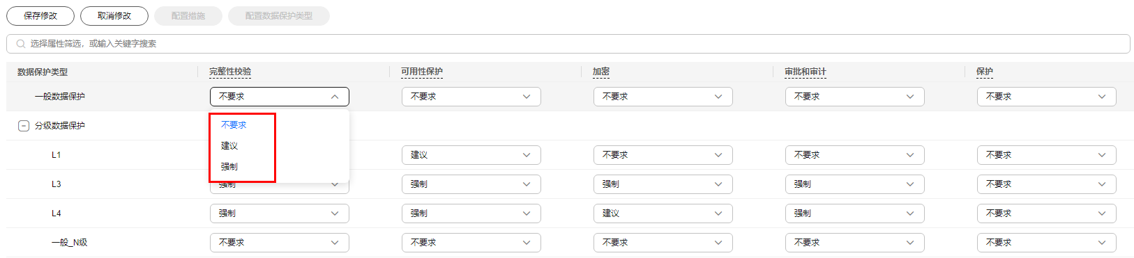 - 单击“修改保护要求”可对数据保护类型对应措施的保护要求进行修改。