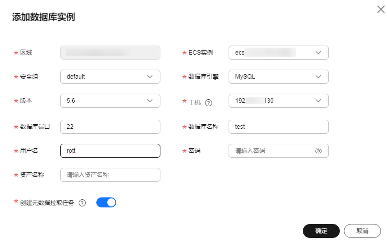 - 如果您的资产是云上数据库类型,则不需要添加实例,请参照授权数据库的操作直接授权DSC访问您的数据库。