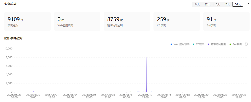 - 各攻击类型统计的次数为用户每次访问网站,在某个时间内被该类型攻击的请求总数。