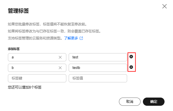 - 如果您需要修改/删除已添加的标签,可在“管理标签”页面中,输入新的标签值或单击右侧的“