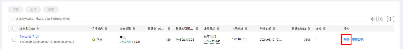 - 在实例列表,选择目标实例,单击操作列的“登录”,进入数据管理服务实例登录界面。