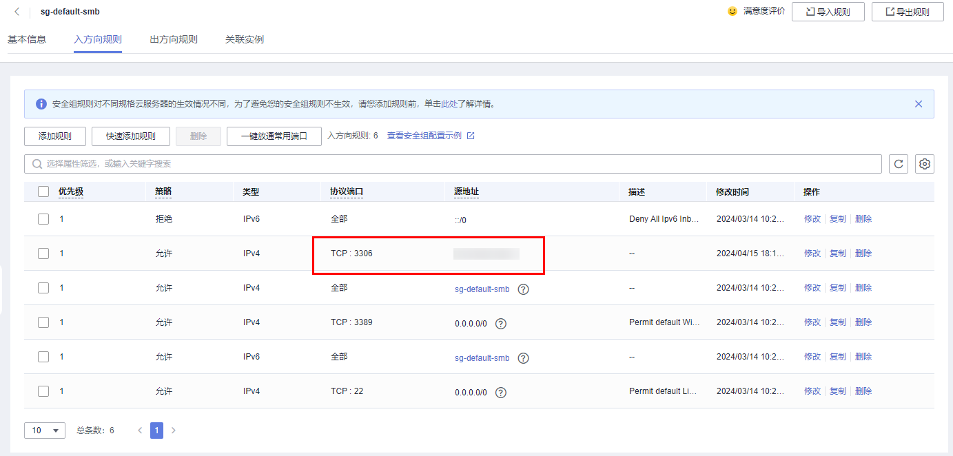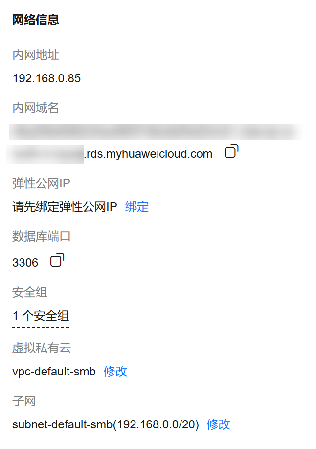 图1 网络信息使用弹性公网IP连接数据库实例时,必须要将弹性公网IP和3306端口加入安全组“sg-default-smb”的入方向规则。具体操作,请参见添加安全组规则。