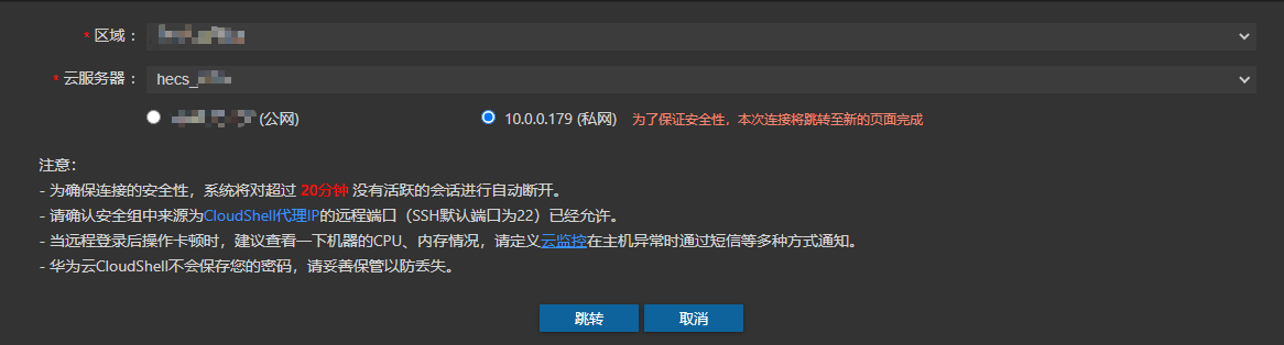 您可以选择使用弹性公网IP或私有IP登录云服务器。