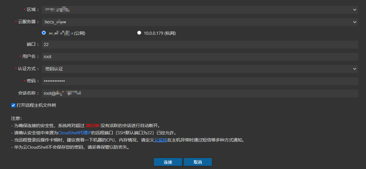 - 在CloudShell配置向导中设置登录云服务器的配置项。