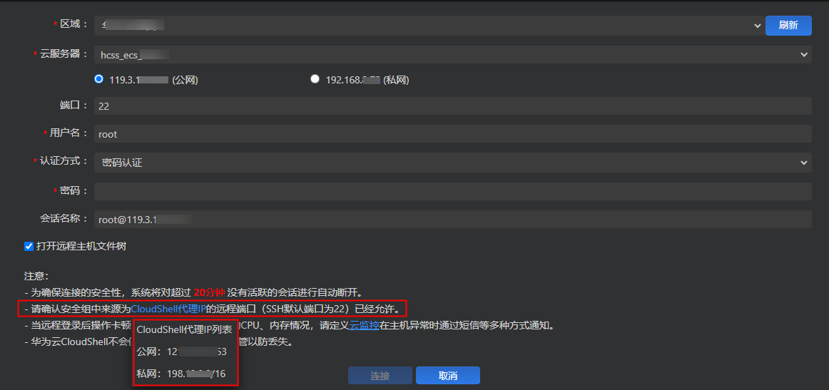 - 请确认安全组中来源为CloudShell代理IP的远程端口(SSH默认端口为22)已经允许,否则无法连接云服务器。各区域的CloudShell代理IP可能不同,请以CloudShell配置界面显示为准。配置安全组规则请参考配置Flexus X实例安全组规则。