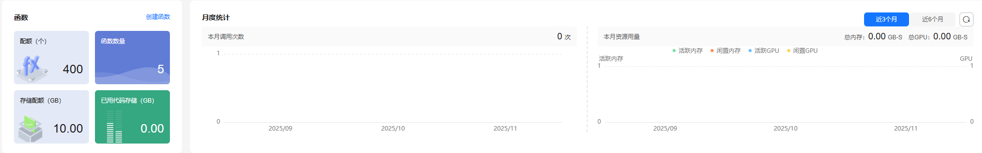 - 可以查看函数数量/配额信息、代码存储/存储配额、函数月度调用次数/月度资源用量。