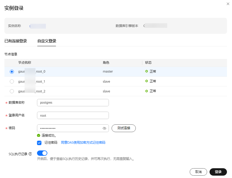 - 在“自定义登录”页签,选择需要登录的节点,正确输入数据库用户名和密码,单击“测试连接”。测试连接通过后,单击“登录”,即可登录到数据库。