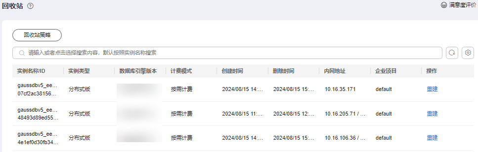 5. 在“回收站”页面,在实例列表中找到需要恢复的目标实例,单击操作列的“重建”