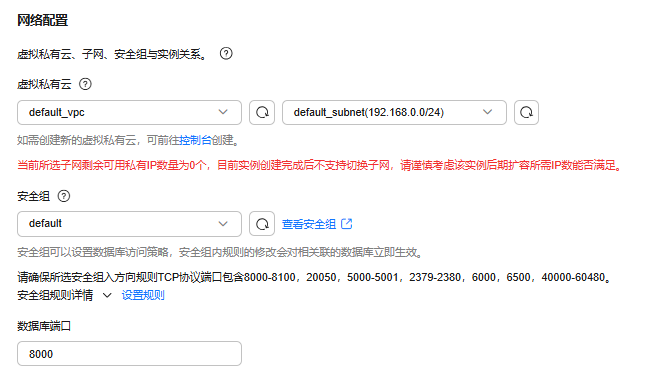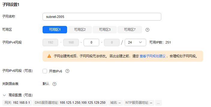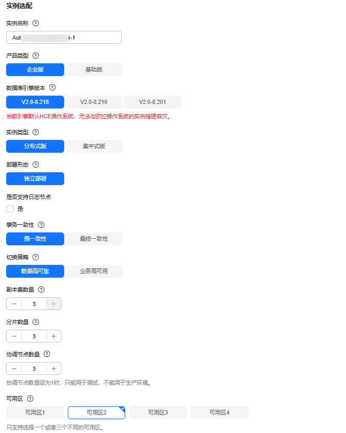 本示例中选择了单可用区,实际建议选择多可用区,以提高实例的高可用性。 |