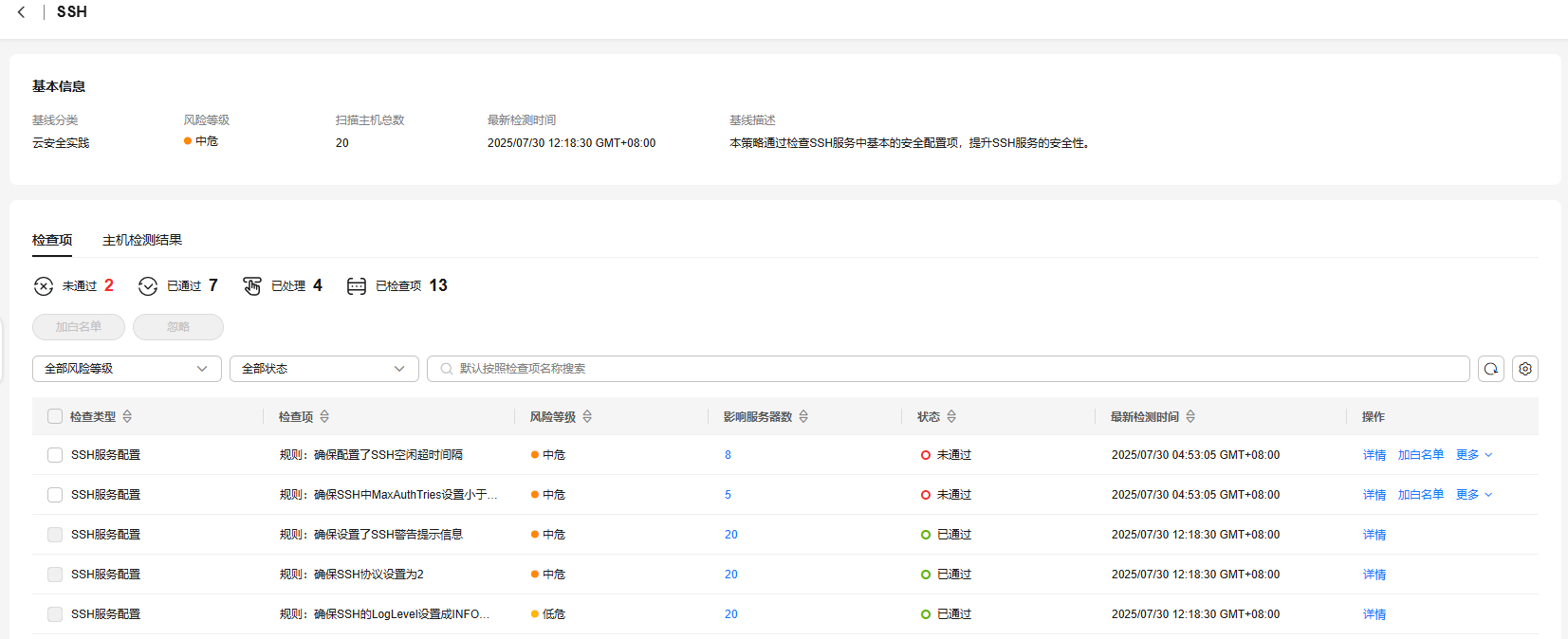 加白后的检查结果,将一直展示在白名单管理列表中,且再次检查时,不会对加白的服务器执行该项检查。