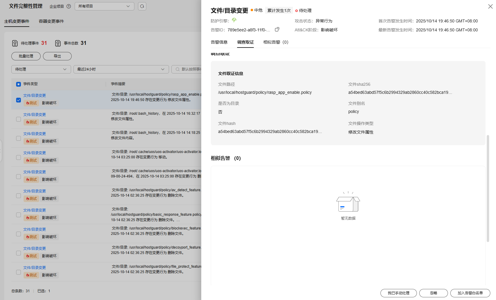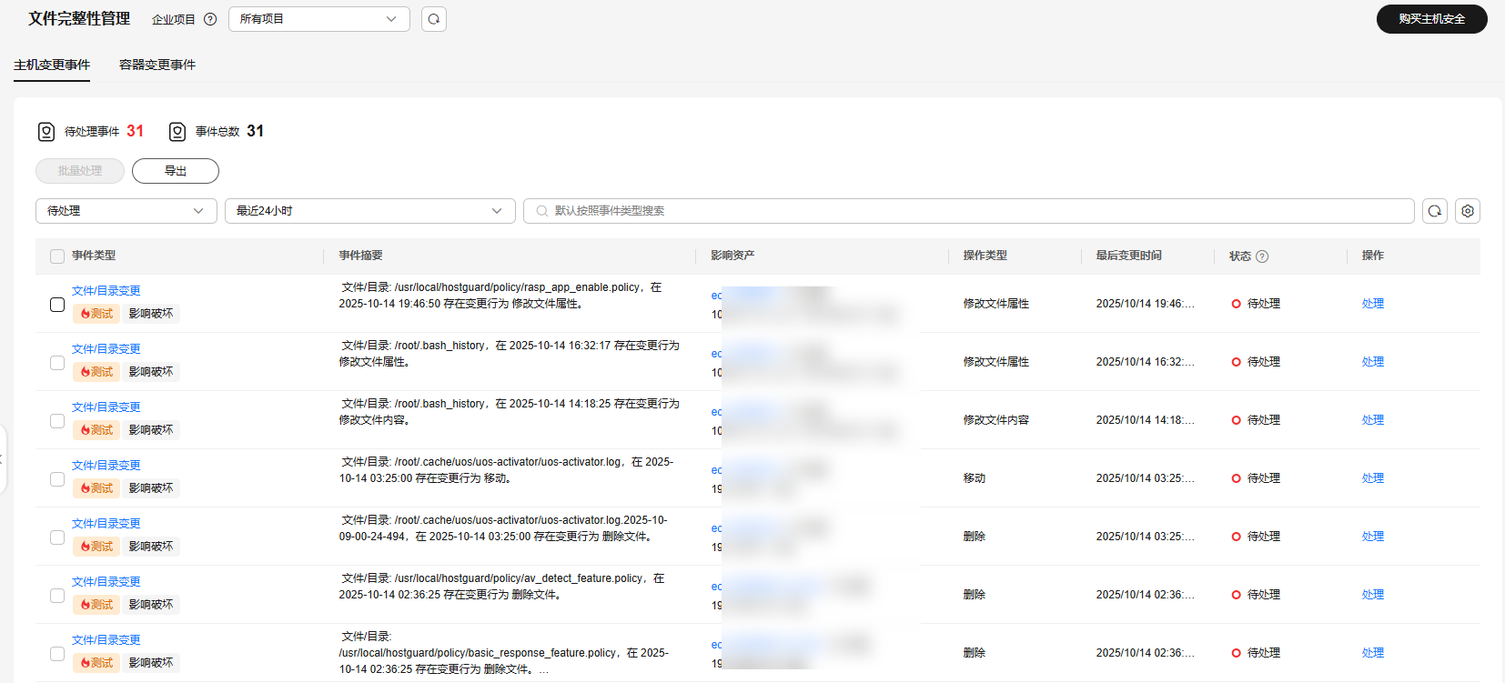 图标,选择区域或项目。 - 在左侧导航栏选择,进入文件完整性管理界面,查看主机或容器文件变更事件。