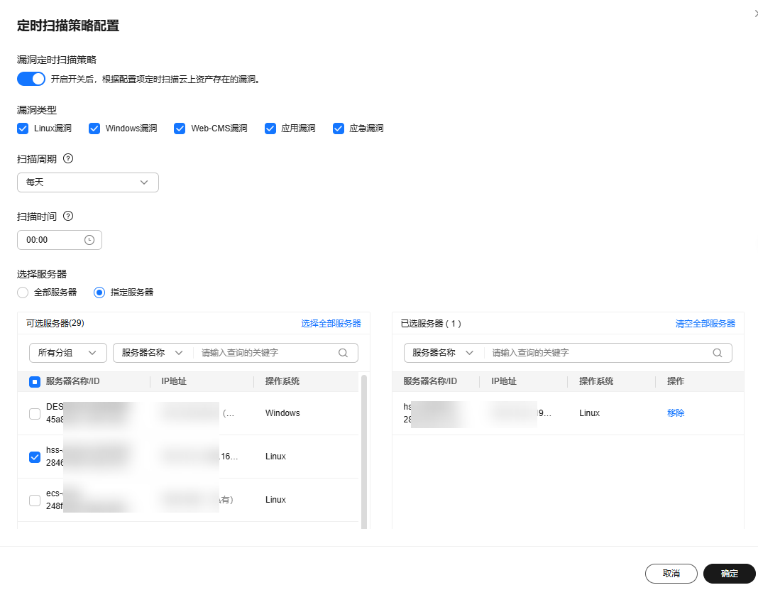 - 在“定时扫描策略配置”页面,配置定时扫描漏洞的周期和服务器范围等参数。