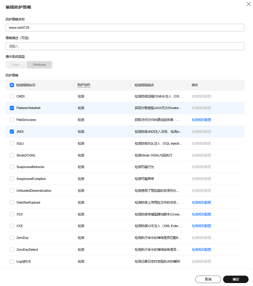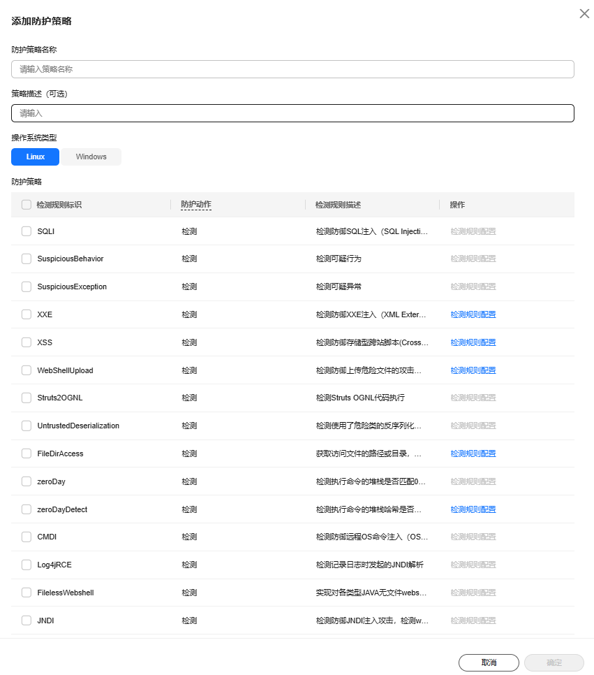 防护动作默认仅支持“检测”,针对目标规则的检测对象进行检测,对检测的风险事件进行告警上报。