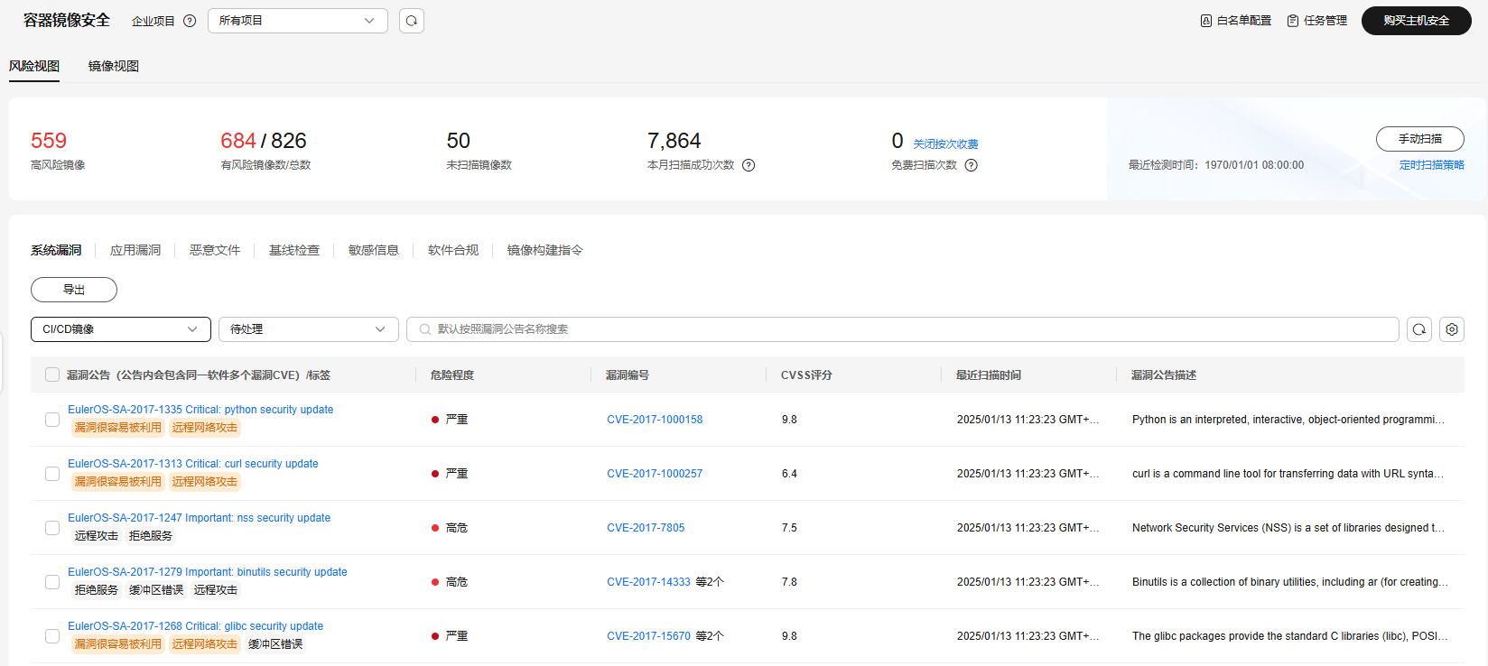 - 风险视图:支持从单个风险的维度查看该风险的所有扫描结果,可查看的风险扫描结果包括系统漏洞、应用漏洞、恶意文件、基线检查、敏感信、软件合规以及镜像构建指令。