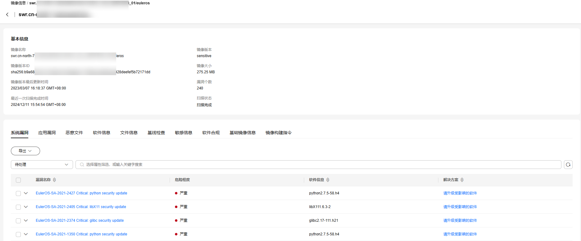 - 在目标镜像所在行的“操作”列,单击“查看结果”,进入镜像扫描结果页面。