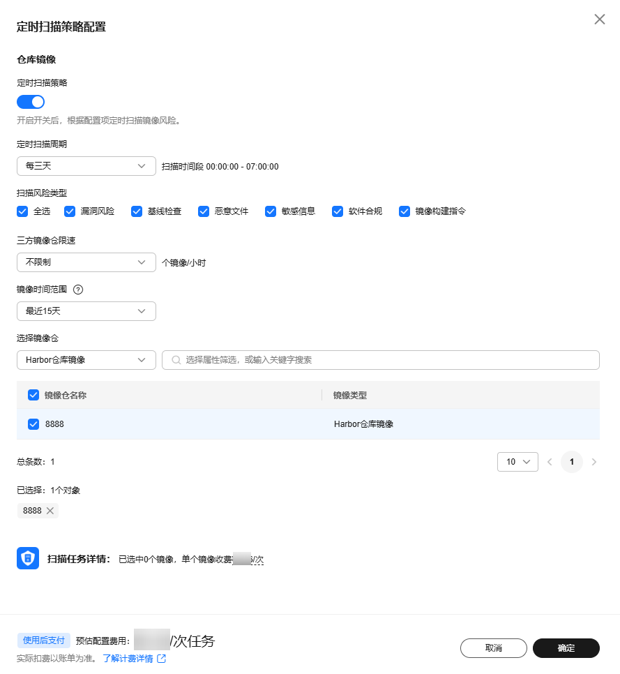 - 定时扫描:设置定时扫描策略,对镜像执行周期性的扫描,适用于定期检测镜像安全,减少镜像安全风险的场景。此扫描方式仅支持扫描三方仓库镜像,如Harbor、Jfrog。