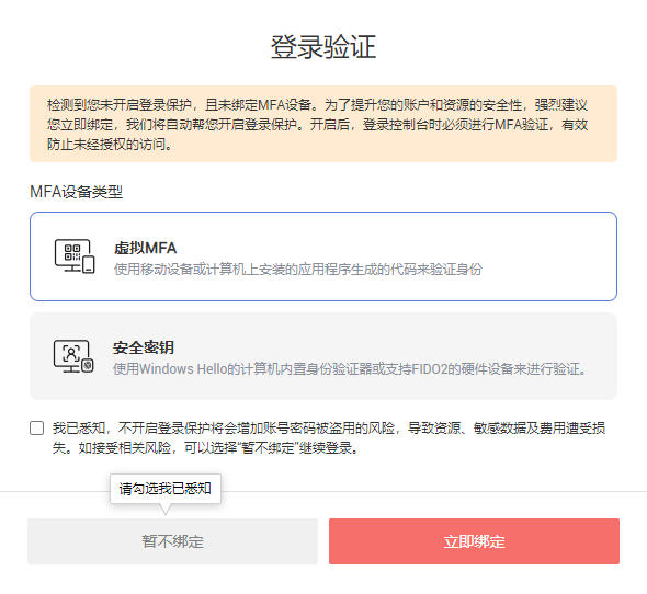 - 在登录验证页面,选择“虚拟MFA”,单击“立即绑定”。