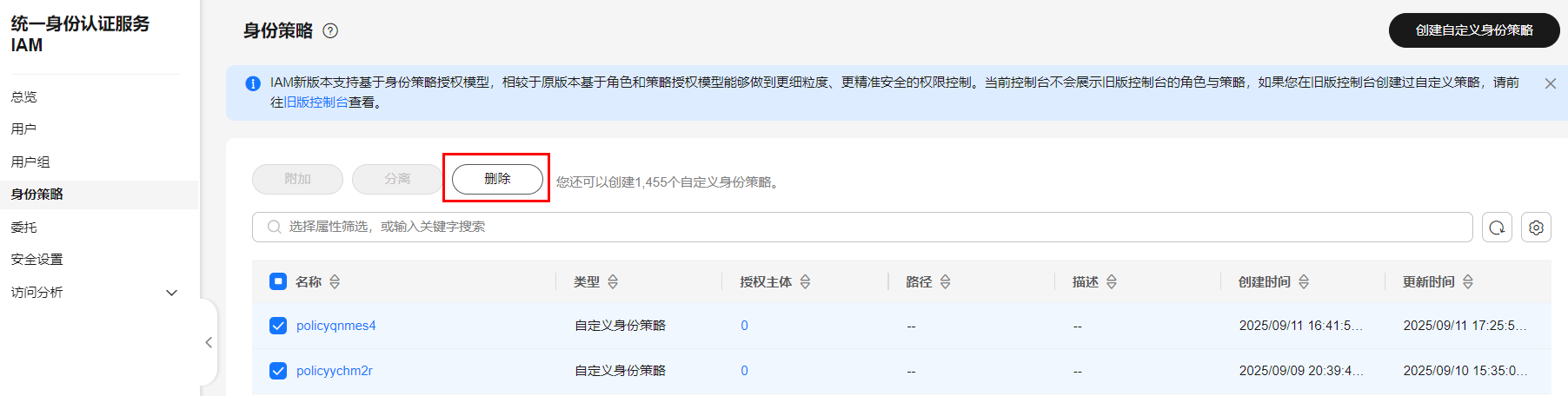 - 勾选需要删除的自定义身份策略。