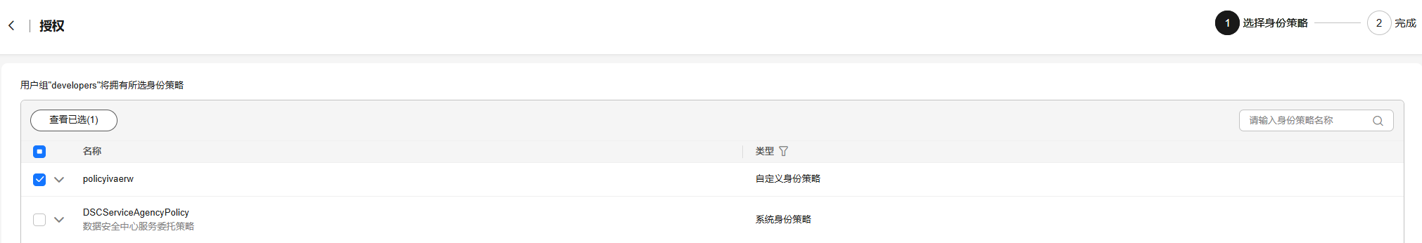 - 在用户组选择身份策略页面中,勾选需要授予用户组的权限。
