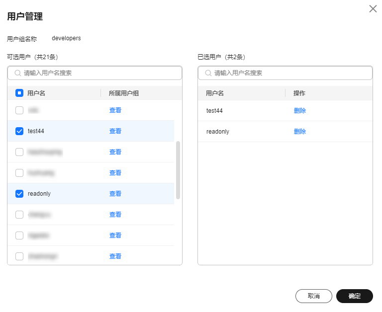 - 管理员在用户组列表中,单击用户组,例如“developers”右侧的“用户组管理”。