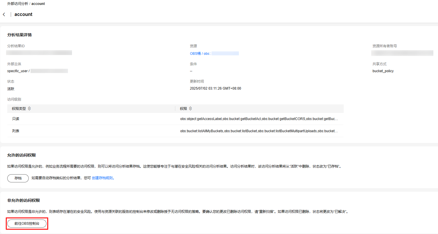 如果分析结果表明策略存在非预期的授权,存在安全风险,需要根据分析结果进行修改或删除策略。例如,对于OBS桶上非预期的共享访问权限,请前往OBS控制台调整策略内容。