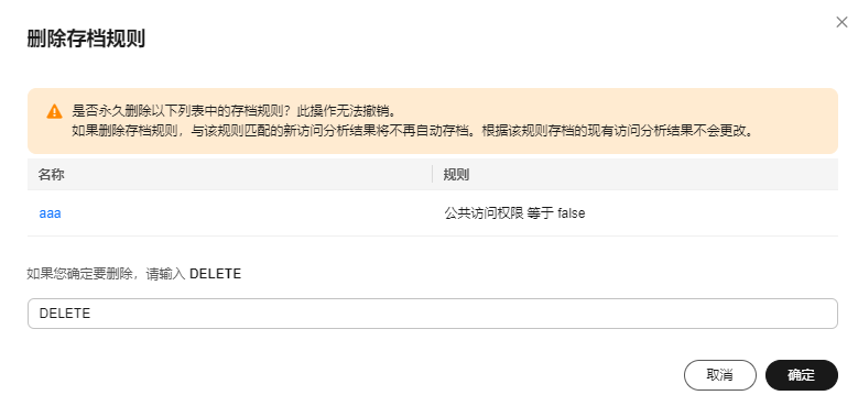 - 确认需要删除规则的信息,在弹窗中输入“DELETE”,单击“确定”。完成删除。