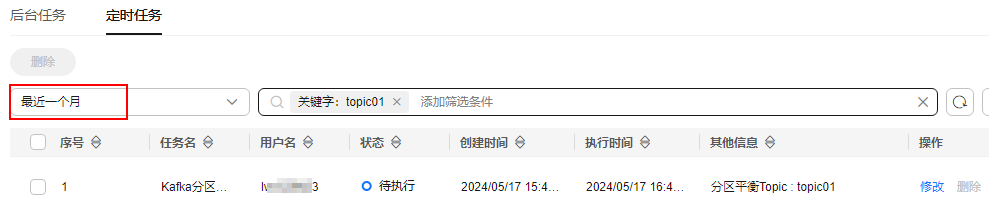 - 在“实例管理 > 后台任务管理”页面的“定时任务”页签中,单击页面左上角下拉框,选择时间段,在搜索对话框中输入待修改定时分区平衡任务的Topic名称,按“Enter”,实现快速查找定时分区平衡任务。