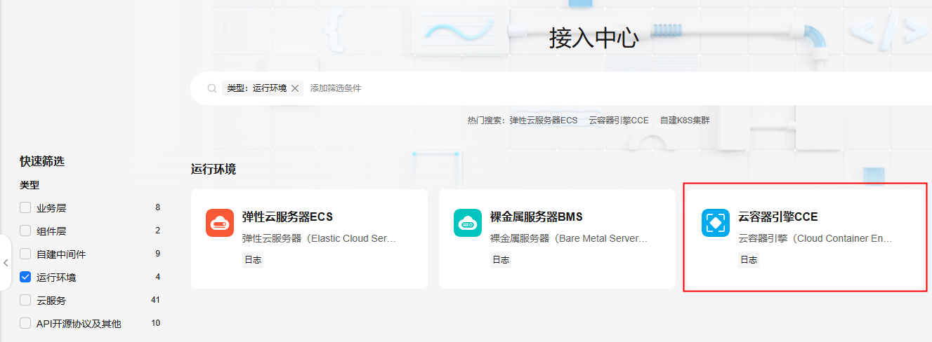 - 在左侧导航栏中,选择“日志接入 > 接入中心”,在类型下方选择“运行环境”或“云服务”,鼠标悬浮在CCE卡片上,单击“接入日志(LTS)”进入配置页面。
