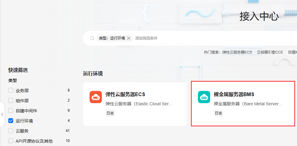 - 在左侧导航栏中,选择“日志接入 > 接入中心”,在类型下方选择“运行环境”或“云服务”,鼠标悬浮在BMS卡片上,单击“接入日志(LTS)”进入配置页面。
