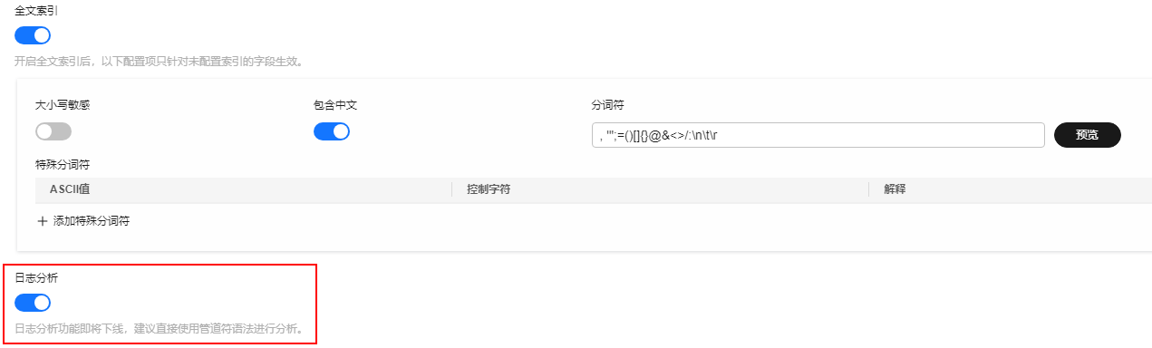 - 如果没有开通管道符方式,需要使用SQL日志分析功能,请开启“日志分析”。