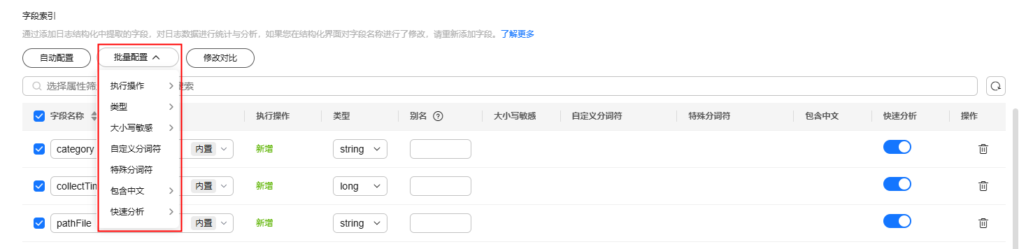 - 修改类型、别名、大小写敏感、自定义分词符、特殊分词符、包含中文、快速分析时,会与原索引配置中的字段进行对比,若任意一项不同,则执行操作变为“修改”。