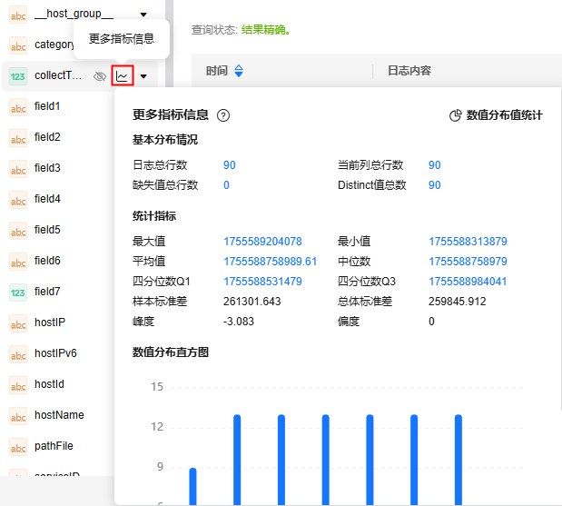 - 数值类型的字段支持展示日志字段基本分布情况(日志总行数、当前列总行数等)、统计指标(最大值、最小值、平均值等)、数值分布直方图。