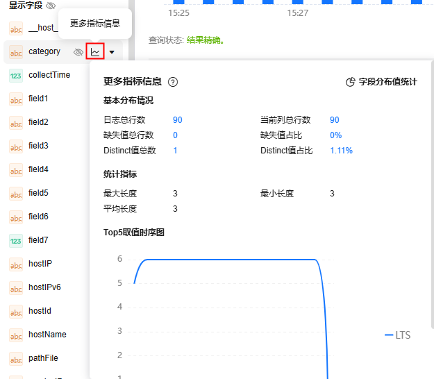 - 字符串类型的字段展示日志字段基本分布情况(日志总行数、当前列总行数等)、统计指标(最大长度、最小长度、平均长度)、Top5取值时序图。
