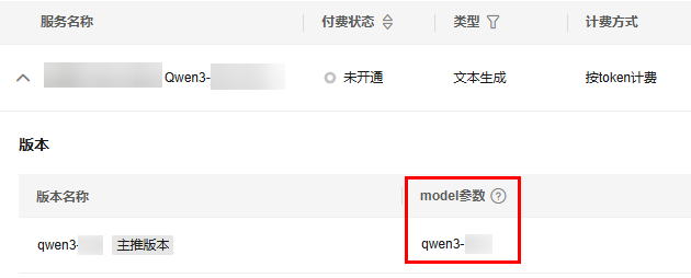 图标,可以查看该服务的版本。“model参数”列显示的名称可用于模型调用时使用,即model参数的值。