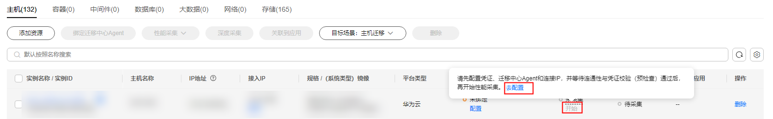 - 如果性能采集列的“开始”按钮置灰,将鼠标移动到“开始”按钮处,在弹出的提示框中,单击“去配置”,弹出配置窗口。