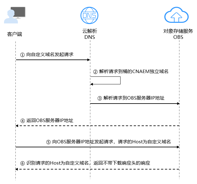 - 客户端向OBS服务器IP地址发起Host为自定义域名的请求。
