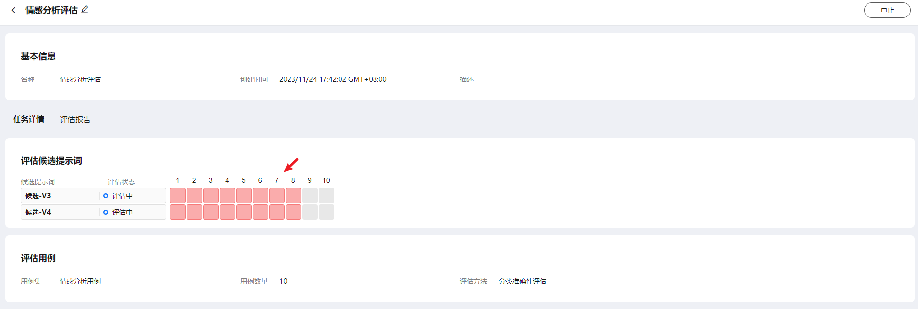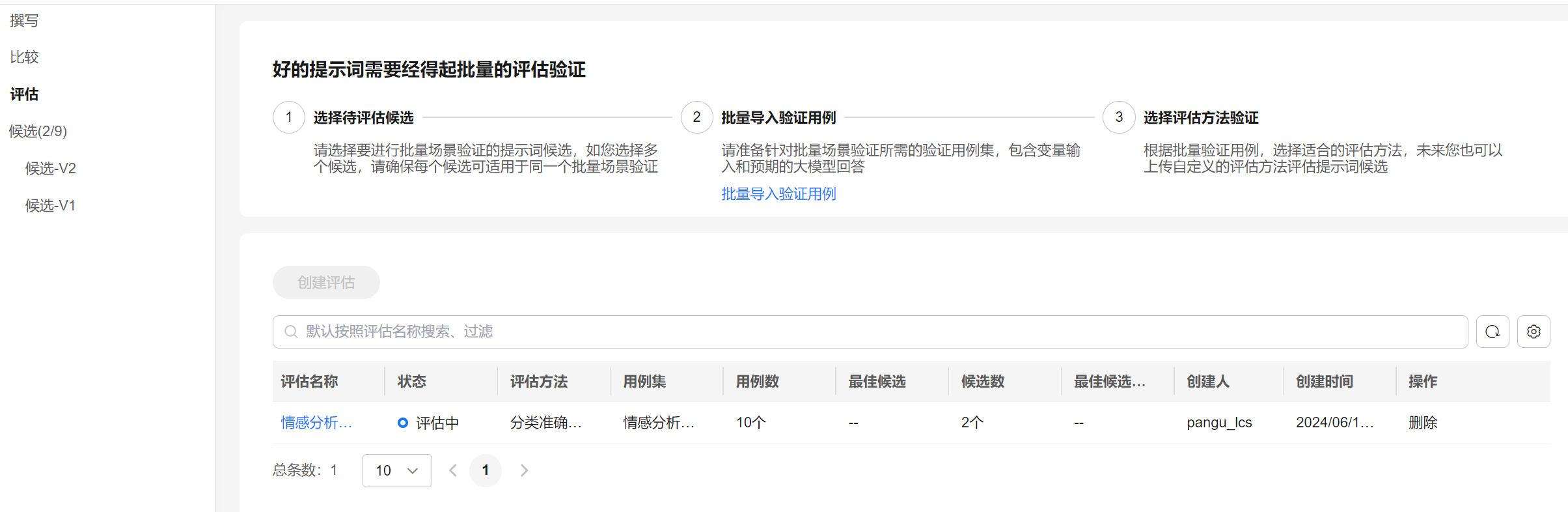 在评估结果中,“预期结果”表示变量值(问题)所预设的期望回答,“生成结果”表示模型回复的结果。通过比对“预期结果”、“生成结果”的差异可以判断提示词效果。