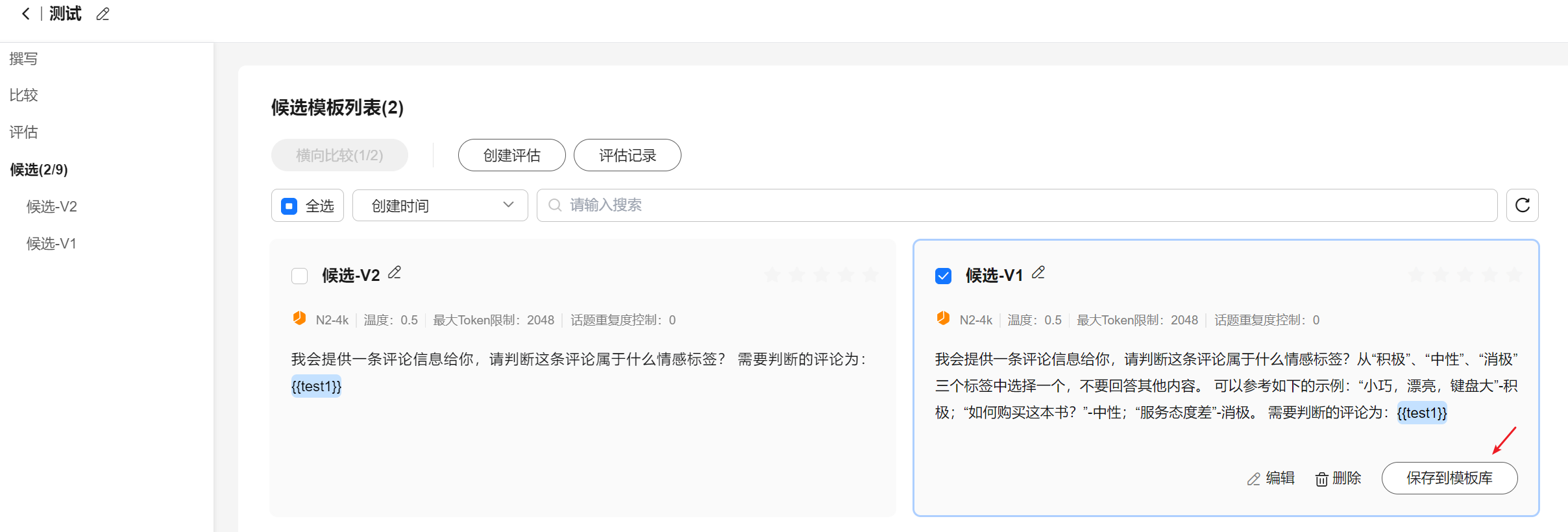 通过横向比较提示词效果和批量评估提示词效果,如果找到高质量的提示词,可以将这些提示词发布至“提示词模板”中。