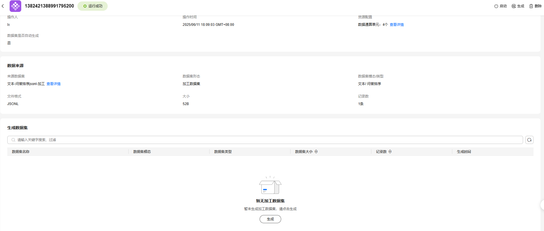 - 当加工任务执行结束且没有生成数据集时,页面提供生成数据集按钮。
