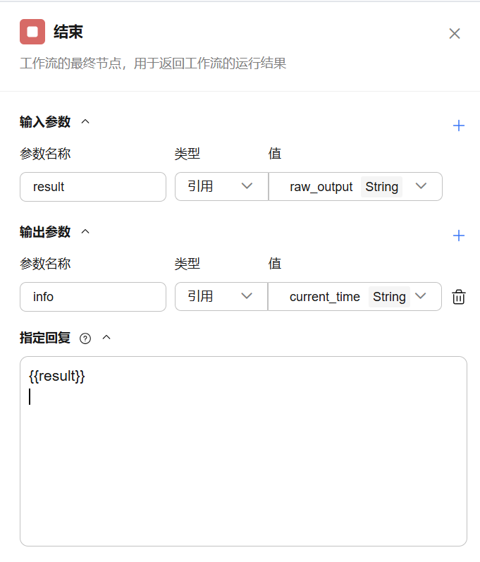 输出参数:输出参数将以变量形式返回,支持引用和输入两种类型。工作流运行结束后会以 JSON 格式返回所有输出参数,适用于子工作流的场景。如果工作流直接绑定了智能体,对话中触发了工作流时,大模型会自动总结 JSON 格式的内容,并以自然语言回复用户。输出参数不能在指定回复中引用。